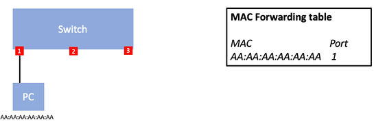 ①スイッチの1番ポートにPC(MAC AA:AA:AA:AA:AA:AA)が接続されている。